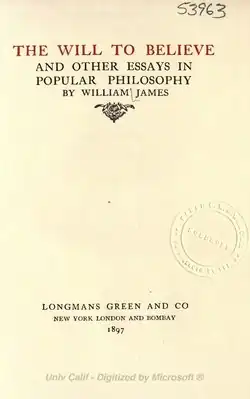 Hypotheses and options, 1. Pascal's wager, 5. Clifford's veto, 8. Psychological causes of belief, 9. Thesis of the Essay, 11. Empiricism and absolutism, 12. Objective certitude and its unattainability, 13. Two different sorts of risks in believing, 17. Some risk unavoidable, 19. Faith may bring forth its own verification, 22. Logical conditions of religious belief, 25.