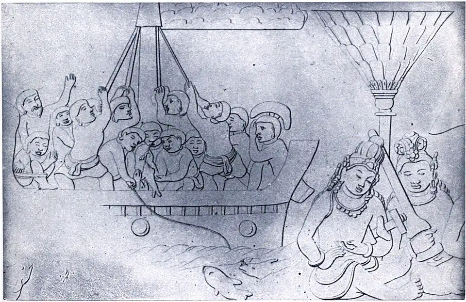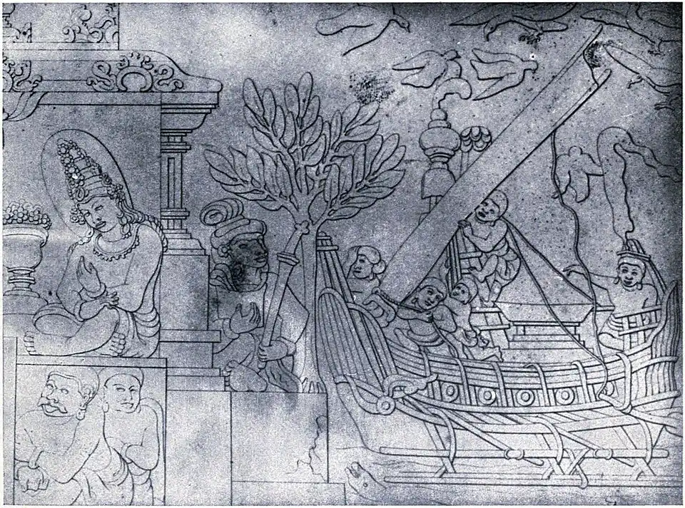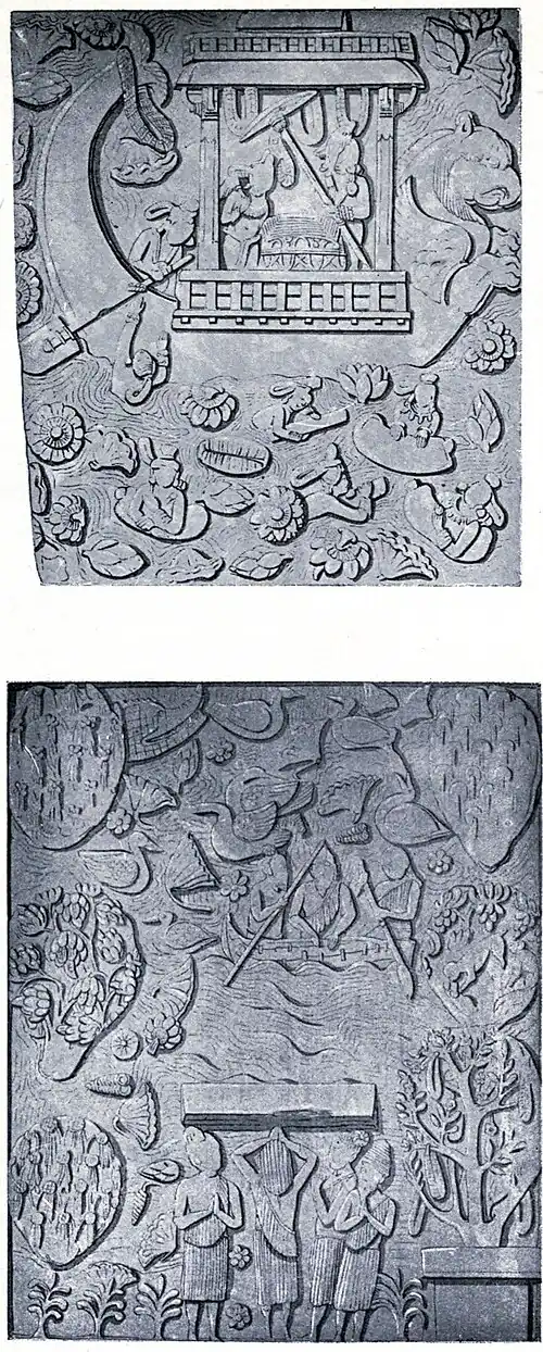 Reproduced from the frieze of the great Buddhist temple at Borobudur, Java, which dates probably from the 7th century A.D. About 600 A.D. there was a great migration from Guzarat in ancient India near the mouths of the Indus to the island of Java, due perhaps to the devastation of Upper India by Scythian tribes and to the drying up of the country.[21]