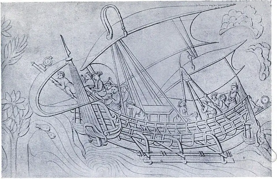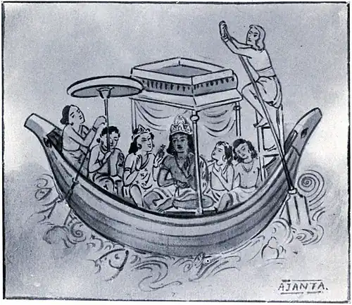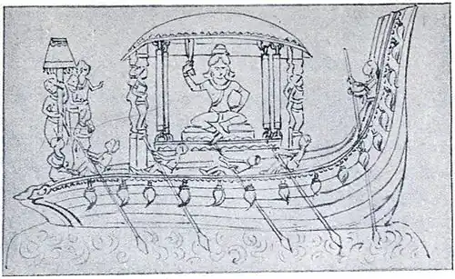 The second representation is that of the emperor's pleasure-boat, which is "like the heraldic lymphad, with painted eyes at stem and stern, a pillared canopy amidships, and an umbrella forward, the steersman being accommodated on a sort of ladder which remotely suggests the steersman's chair in the modern Burmese row-boats; while a rower is in the bows."[15] The vessel is of the Madhyamandirā type, and corresponds exactly to the form of those vessels which, according to the Yuktikalpataru, are to be used in pleasure trips by kings.