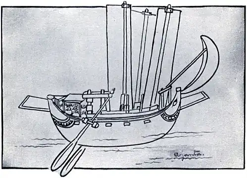 The form of these ships closely resembles that of a catamaran, and somewhat answers to the following description of some Indian ships given by Nicolo Conti in the earlier part of the 15th century: "The natives of India build some ships larger than ours, capable of containing 2,000 butts, and with five sails and as many masts. The lower part is constructed with triple planks, in order to withstand the force of the tempests to which they are much exposed. But some ships are so built in compartments that should one part be shattered the other portion remaining entire may accomplish the voyage."[19]
