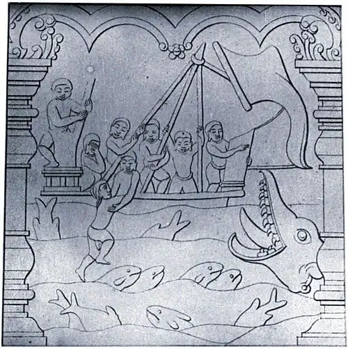 or string. "It represents a river or a sheet of fresh water with a canoe crossing it, and carrying three men in the ascetic priestly costume, two propelling and steering the boat, and the central figure, with hands resting on the gunwale, facing towards four ascetics, who are standing in reverential attitude at the water's edge below."[1] According to Sir A. Cunningham,[2] the figures in the boat represent Sakya Buddha and his two principal followers; and Buddha himself has been compared in many Buddhist writings to "a boat and oar in the vast ocean of life and death."[3] But General F. C. Maisley is inclined to view this sculpture "as representing merely the departure on some expedition or mission of an ascetic, or priest, of rank amid the reverential farewells of his followers."[4] His main reasons for supporting this view are, firstly, that no representations of Buddha in human shape were resorted to until several centuries later than the date of these sculptures; and, secondly, because the representation is that of a common thong-bound canoe and not of a sacred barge suiting the great Buddha. There is another sculpture to be found on the Western Gateway of No. 1 Stupa at Sanchi which "represents a piece of water, with a barge floating on it whose prow is formed by a winged gryphon and stern by a fish's tail. The barge contains a pavilion overshadowing a vacant throne, over which a male attendant holds a chatta, while another man has a chaori; a third man is steering or propelling the vessel with a large paddle. In the water are fresh-water flowers and buds and a large shell; and there are five men floating about, holding on by spars and inflated skins, while a sixth appears to be asking the occupant of the stern of the vessel for help out of the water."[5] This sculpture appears simply to represent the royal state barge, which quite anticipates its modern successors used by Indian nobles at the present day, and the scene is that of the king and some of his courtiers disporting themselves in an artificial piece of water; but it is also capable of a symbolical meaning, especially when we consider that the shape of the barge here shown is that of the sacred Makara, the fish avatara or Jataka of the Buddhist, just as the Hindu scriptures make the Matsya, or fish, the first of the avatars of Vishnu, whose latest incarnation was Buddha. According to Lieutenant Massey, however, this sculpture represents the conveyance of relics from India to Ceylon which is intercepted by Nagas.[6]
