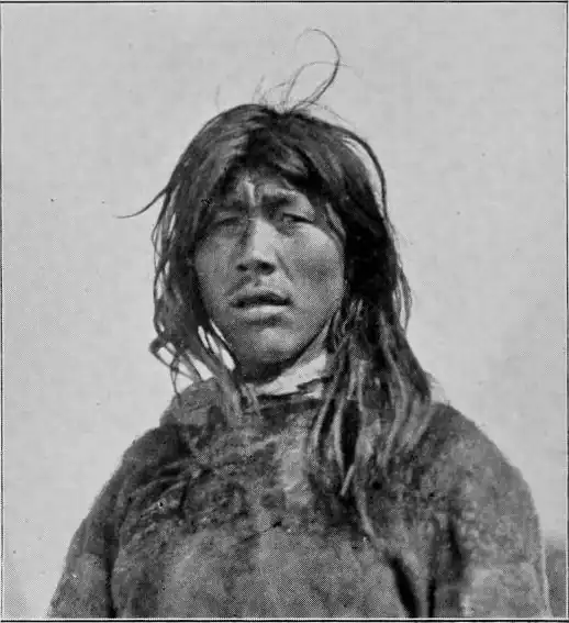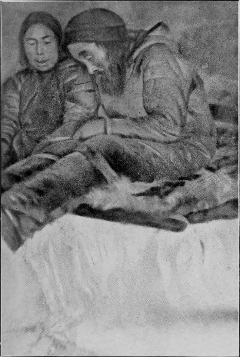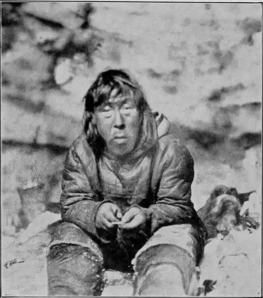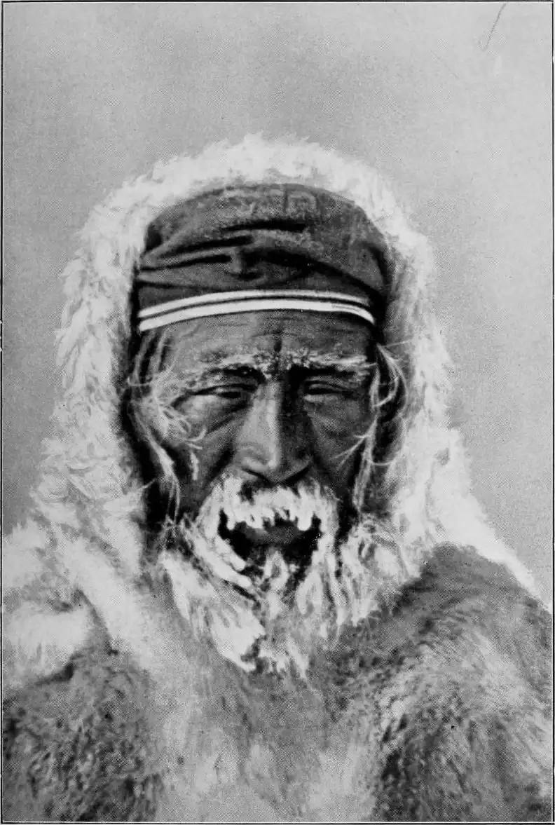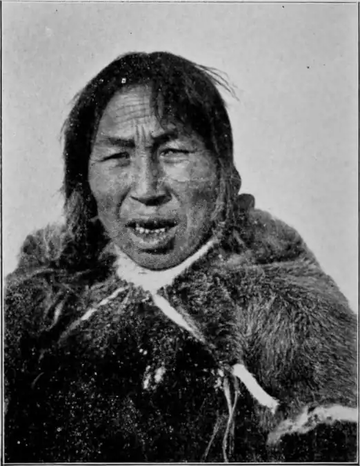 "'Kivkaq,' she said (literally, 'you my gnawed bone,' which was her pet name for Padloq, whom she knew well) 'Kivkaq, I have eaten my elder brother and my children.' 'My elder brother' was her pet name for her husband. Padloq and I looked at each other, and could not understand that she was still alive and breathing. There was nothing of her but bones and dry skin, there seemed indeed hardly to be a drop of blood in all her body, and she had not even much clothing left, having eaten a great deal of that, both the sleeves and all the lower part of her outer furs. Padloq bent down quite close, to hear better, and Ataguvtâluk — for we knew her now, and could see who it was — said once more: