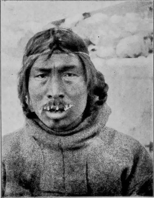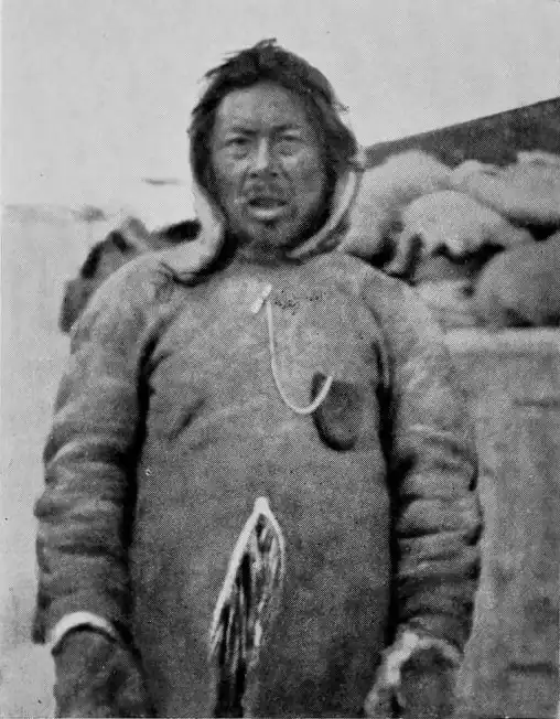 It was towards the end of February 1922. The country in which we were to spend the winter was still quite new to us, and as we had a great number of dogs that needed plenty of food, we could not follow the example of the local Eskimos and make do with caribou meat, which is very wasteful in use, and does not contain sufficient fat for dogs kept hard at work. We were therefore constantly going off with our Polar Eskimo hunters in search of grounds where we could get walrus, which is the best food for dogs. On one of these hunting expeditions we had come up to the neighbourhood of Cape Elisabeth, north of Lyon Inlet, where, as we had been told, there were walrus to be found out on the young ice beyond the fringe of the old. We had had a long day's journey in the cold, and were now, in the fine starry night, just ready to set about building a snow hut, when suddenly, out of the darkness ahead, there appeared a long sledge with one of the wildest teams I have ever seen. Fifteen white dogs were racing along at full gallop with one of the big Hudson Bay sledges, at least 7 metres long, and six men on it. They sighted us, and came sweeping down right on top of us, and a little man with a big beard, his face covered with ice, leapt down and came running towards me. He stopped, and after shaking hands in white men's fashion, pointed up inland towards a hollow where, he explained, he and his party had their dwelling. His keen eyes rested on me, full of life and spirits, and he greeted me with a ringing: qujäɳnamik "Thanks, thanks to the guests who have come."