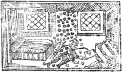 In this pitiable condition, the sixth and last morning dawned upon Vivenzio, if dawn it might be called—the dim obscure light which faintly struggled through the one solitary window of his dungeon. He could hardly be said to notice the melancholy token. And yet he did notice it; for as he raised his eyes and saw the portentous sign, there was a slight convulsive distortion of his countenance. But what did attract his notice, and at the sight of which his agitation was excessive, was the change his iron bed had undergone. It was a bed no longer. It stood before him, the visible semblance of a funeral couch or bier. When he beheld this, he started from the ground; and, in raising himself, suddenly struck his head against the roof, which was now so low that he could no longer stand upright. “God’s will be done!” was all he said, as he crouched his body, and placed his hand upon the bier; for such it was. The iron bedstead had been so contrived, by the mechanical art of Ludovico Sforza, that as the advancing walls came in contact with its head and feet, a pressure was produced upon concealed springs, which when made to playset in motion a very simple though ingeniously contrived machinery, that effected the transformation. The object was, of course, to heighten, in the closing scene of this horrible drama, all the feelings of despair and anguish which the preceding ones had aroused. For the same reason, the last window was so made as to admit only a shadowy kind of gloom, rather than light, that the wretched captive might be surrounded, as it were, with every seeming preparation for approaching death.