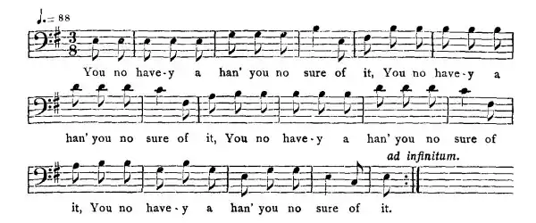 Assono[1] an' Anansi make a dance and invite Goat and Dog to the dance. Anansi make bargain with Assono that when Goat an' Dog come in, he mus' sit down at one door an' Anansi at the other. Assono sing, (repeat three times)--