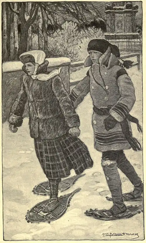 The daylight hours were far too few for the girl's enjoyment. Night after night, she and Janet and Ronald pushed back their chairs from the table and, stopping only for their wraps and the toboggan, betook themselves to the terrace. Or else, slinging their snowshoes on their backs, they hailed a car for the toll-gate whence they started for a long cross-country tramp, over the level fields glistening white in the moonlight, along the crest of the cliff above the gleaming river, then on and on through the trees, until Sillery Point was behind them and the stillness of the winter night was unbroken by any human sound. And the evening always ended with a row of chairs drawn up before the blazing fire at home, while they ate the supper which Mrs. Leslie had made ready for their coming. And always, before the evening was ended, one of the young voices was sure to say wishfully,—
