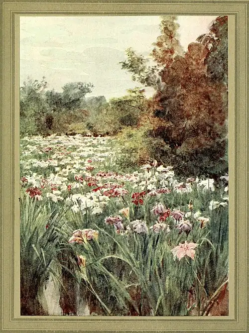 It can hardly be pretended that this is a true garden topic, but so much garden lore and cult is included in its study that it would seem a pity to exclude it. The main scientific principle which is its basis is the same as that of the landscape artist—that is, a representation of Nature on a small scale. It is, like the tea-tray gardens, a display of a portion of scenery for the house and for intimate contemplation, and is always more than a simple bunch of flowers in a vase, or a bit of interior decoration. It is a method of artistic composition, too, like Japanese gardens, depending less on masses of colour and brilliancy of bloom than on the disposition of line, on effects of light and shade obtained by the relief of blocks of foliage, by the slender lines of stems. In a word, both depend more on the drawing than on the colouring of the picture, although this does not imply that, to a cultivated eye, the colour is ever absent.