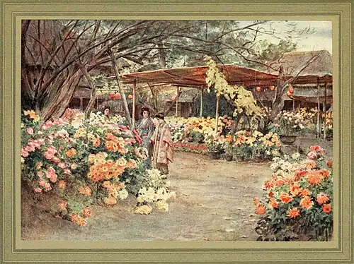 - ↑ This festival was inaugurated in the ninth century (of our era) by the Emperor Sago. It still occurs annually—of late years in the garden of the old summer palace of the Shoguns, Shiva Kikyu.