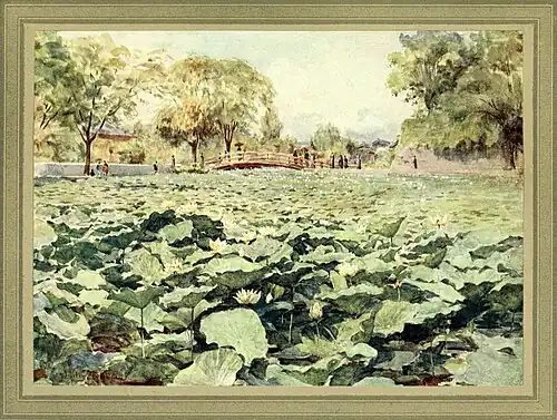 I like the idea, more especially in that land of unfailing springs, for there it has not the sadness, the tragedy even, that the sentiment might suggest in places where the wells are not of eternal life, but even of a briefer space than man’s. One might remark—but luckily it has nothing to do with gardens—that some of their wells, whose water comes from but little below the surface, where it is contaminated by the drainings from house and yard, and is trustingly used for drinking, are veritable wells of death, not life! This is one of the reasons why tea, the national beverage of the country, is so much safer to drink than the favourite tipple of my own land—‘ice-water.’ (It is not ‘iced,’ but ice-water in name as in reality. Lumps of ice fill the tumbler and a little water is put with them. ‘Iced’ water means water cooled in bottles on ice.)