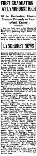 First Graduation At Lyndhurst High. 46 in Graduation Class. Students Formerly to Rutherford, Kearny. For the first time in the history of Lyndhurst, class will be graduated from the Lyndhurst High School tonight. Until four years ago all local high school students were sent to Rutherford or Kearny High Schools. The present graduating class began their work in the freshman year in several rooms of the Jefferson School before the present high school building was completed. Forty-six of these pupils will be, graduated in the first class to go out of Lyndhurst High School. The invocation will be by the Rev. George Muller, pastor of St. Matthews Lutheran Church. The salutatory address will be given by Margaret Breglia; and the valedictory by John F. Woods, Jr. Essays will be read by Ida A. Giairno, on "The Growth of Musty': Howard F. Kessler. "History of Football"; Margaret G. Lipcsei, "Student Participation.in School Government." Charlotte M. Aeskler will play a piano solo. The commencement address will be delivered by Cameron Beck, head of the personnel department of the New York Stock Exchange. Diplomas will be presented by Maurice W. Murphy, president of the Board of Education. Prizes will be awarded by Supervising Principal Reeves D. Batten. Honor pupils are John F. Woods, Margaret Breglia, Laura Ehrlich, Lillian Catzeisitein, Olga Zawadski, Ida Claim, Ruth Solow, Dorothy Bonn, Margaret Lipcsci, Louis Ravizza. Other graduates are John Richard Adams, Mildred M. Anderson, Edith Beeby, Charlotte M. Beseler, George A. Bollenbach, Margaret M. Carroll, Pearl E. Clay, George A. Cohn, Ann Czarnecki, Harold Daiker, Gladys A. Frankoff, Lucie G. Filippone, Charles Freudenberg, Walter T. Gaynor, Richard A. Gronendyke, Emily A. Guidetti, Howard F. Kessler, Lottie V. Kowaleskie, Agnes F. Lynch, Joseph M. Longo, James E. Lothian, Ralph Mahan, Jr, Robert B. Mahan, Violet Miller, Arthur J. O'Connor, Harry O. Oswald, Anna M. Palazzo, Robert C. Pattison, Alfred Richards, Peter R. Russo, Carmine F. Savino, Joseph R. Stellate, Catherine D. Stringfield, Ruth E. Urquhart, Ralph T. Wengland, William Woods. The class flower is the American Beauty Rose; and the colors blue and gold; the motto. "In Ourselves Our Future Lies."