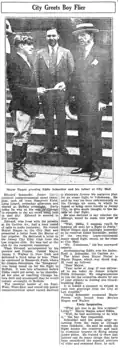 City Greets Boy Flier. Edward Schneider, Jersey City's youthful transcontinental speed champion, took off from Roosevelt Field, Long Island, yesterday afternoon and stayed at Buffalo overnight. Early today he was on his way to Chicago to compete in the air races being held in that city. Edward is entered in five events. Edward, who lives with his parents at 114 Carlton Avenue, had a busy round of calls to make yesterday. He visited Mayor Hague at the City Hall and presented a letter from the Mayor of Los Angeles. He delivered a letter to the Jersey City Elks' Club from the Los Angeles club. He was met at the club by the reception committee. Then Edward, accompanied by his parents and friends, visited Mayor James J. Walker in New York and delivered a third letter to him. Then he continued to Roosevelt Field, where his Cessna monoplane, the "Kangaroo" was being tuned up for the flight to Buffalo. It was late afternoon before Eddie could get away, so he abandoned his plan of reaching Chicago before dark and announced that he would remain overnight in Buffalo. The youthful holder of the East-West, West-East and round-trip junior transcontinental speed record declined to elaborate further his tentative plan for an ocean flight to Yokohama. He said he was too busy concentrating on the Chicago air races, in which he hoped to bring more laurels to Jersey City, give much thought to the details of that flight. He also also declined to say whether, the attempt would be made this year, or next. "Well, Eddie, I suppose you'll be hopping off next for a flight to Paris," Mayor Hague said smilingly yesterday as he received Eddie Schneider, holder of the two-way trans-continental junior speed flight record, on the steps at City Hall. "No. Yokohama," the boy answered soberly. Accompanying Eddie was his father, Emil A. Schneider, 114 Carlton Avenue. The letter from Mayor Porter to Mayor Hague, which was dated August 13, read as follows: "Dear Mayor, Your letter of Aug. 12 was delivered to me today by Junior Aviator Eddie Schneider. My congratulations to you for the enterprise shown by one of your citizens in making this record-breaking flight. It is indeed a pleasure to extend to your city greetings from the City of Los Angeles." Young Schneider presented Mayor Porter with letters from Mayors Hague and Walker. Lindy Inspiration. "What got you to go into aviation? Lindy?" Mayor Hague asked Eddie. "Well, he had something to do with it," the boy flier responded. Schneider said his plans after returning from the races at Chicago were indefinite. He said he made the flight across the continent and back to stimulate interest in flying among junior pilots. He wanted to show that juniors can do many things that have been considered the especial province of older and seasoned fliers, he said.