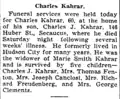 Funeral services were held today for Charles Kahrar, 60, at the home of his son, Charles J. Kahrar, 146 Huber Street, Secaucus, where he died Saturday night following several weeks illness. He formerly lived in Hudson City for many years. He was the widower of Marie Smith Kahrar and is survived by five children — Charles J. Kahrar, Mrs. Thomas Fenton, Mrs. Joseph Cancalosi, Mrs. Richard Freudenberg, and Mrs. George Clements.