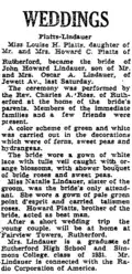 Platts - Lindauer. Miss Louise H. Platts, daughter of Mr. and Mrs. Howard C. Platts of Rutherford, became the bride of John Howard Lindauer, son of Mr. and Mrs. Oscar A. Lindauer, of Jewett Avenue, last Saturday. The ceremony was performed by the Reverend Charles A. Rose of Rutherford at the home of the bride's parents. Members of the immediate families and a few friends were present. A color scheme of green and white was carried out in the decorations which were of ferns, sweet peas, and hydrangeas. The bride wore a gown of white lace with a tulle veil caught with orange blossoms, with shower bouquet of bride roses and sweet peas. Miss Natalie Lindauer, sister of the groom, was the bride's only attendant. She wore a gown of pale green point d'esprit and carried talisman roses. Howard Platts, brother of the bride, acted as best man. After a short wedding trip, the young couple will be at home at Fairview Towers, Rutherford. Mrs. Lindauer is a graduate of Rutherford High School and Simmons College class of 1931. Mr. Lindauer is connected with the Radio Corporation of America.