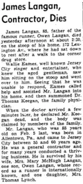 James Langan, 85, father of the famous runner, Owen Langan, died yesterday afternoon at about 2:30, on the stoop of his home, 172 Lexington Avenue, where he had sat down to rest after a walk to the corner drug store. Wallie Eames, well known Jersey City singer and entertainer, who knew the aged gentleman, saw him sitting on the stoop and went over to him. Seeing that he was unable to respond, Eames called help and assisted Mr. Langan into his home, and then summoned Dr. Thomas Keegan, the family physician. When the doctor arrived a few minutes he declared Mr. Langan dead, and the body was claimed by members of the family. Mr. Langan, who was 85 years old on February 5 last, was born in Allentown, Pennsylvania, and came to Jersey City between 55 and 60 years ago. He was a general contractor and for many years conducted a thriving business. He is survived by his wife, Mrs. Mary McHugh Langan, one son, Owen Langan, whose record as a runner is internationally known, and one daughter, Mrs. Thomas Lynch.
