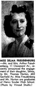 Miss Selma Freudenberg. Mr. and Mrs. Arthur Freudenberg, 11 Claremont Avenue, recently announced the engagement of their daughter, Selma, to Mr. Thomas Norton, 603 Garfield Avenue. Miss Freudenberg and Mr. Norton are graduates of Henry Snyder High School.