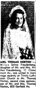 Mrs. Thomas Norton. Miss Selma Freudenberg, daughter of Mr. and Mrs. Arthur Freudenberg, 11 Claremont Avenue, was united in marriage recently at Trinity Lutheran Church to Mr. Thomas Norton, second class seaman, son of Mr. and Mrs. Thomas Norton, 603 Garfield Avenue.
