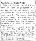 Algernon Skinner, 78, of 9 Hancock Avenue, died of gangrene in a leg Thursday at the Medical Center, where he had been a patient since November 7. The funeral was to be held today. He was born in Port Orange, New York, where he been a farmer until his retirement 20 years ago, when he moved to Jersey City. Mr. Skinner is survived by his wife, Mrs. Nora Skinner nee Piatt; his sons, George and Robert Skinner; his daughters. Mrs. Winifred McManus and Mrs. Florence Freudenberg, and a stepdaughter, Mrs. Nora Freudenberg.