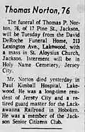 The funeral of Thomas Patrick Norton, 76, of 17 Pine Street, Jackson, New Jersey will be Tuesday from the David DeRoche Funeral Home, 213 Lexington Avenue, Lakewood, with a mass in St. Aloysius Church, Jackson. Interment will be in Holy Name Cemetery, Jersey City. Mr. Norton died yesterday at Paul Kimball Hospital, Lakewood. He was a longtime resident of Jersey City and a retired yardmaster for the Lackawanna Railroad in Hoboken. He was a member of the local Senior Citizens Club.