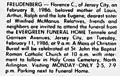 Freudenberg — Florence C. of Jersey City on February 8, 1986 beloved mother of Louis, Arthur, Ralph and the late Eugene; dearest sister of Winifred McManus. Relatives friends and neighbors are invited to attend the funeral from the Evergreen Funeral Home, Tonnele and Garrison Avenues, Jersey City on Tuesday, February 11, 1986 at 9 a.m. A Mass of Christian Burial will be celebrated at St. John the Baptist Roman Catholic Church at 10 a.m. with interment to follow in Holy Cross Cemetery, North Arlington. Visiting Monday Only 2-5, 7-9 p.m. Parking next to Funeral Home.