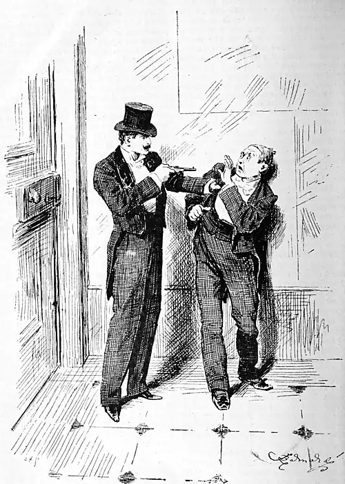 As the glass flew, for my reputation as a pistol shot was not belied in this critical moment, Mrs. Kavanagh ran in a wild fit of hysterical screaming to her bedroom above—but the four men turned with loud cries to the door where they had seen me; and as I saw them coming, I prayed that Abel might be there. This thought need not have occurred to me. Scarce had the men taken two steps when the glass of the balcony windows was burst in with a crash, and the whole room seemed to fill with police.