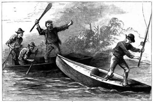 "Matt threw his paddle at me when he saw that I was about to slip through his fingers, and I threw it back," answered Joe. "It didn't hit Matt, as I meant it should, but it came pretty near knocking Jake out of the scow."