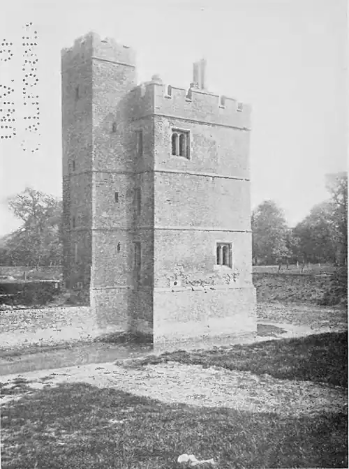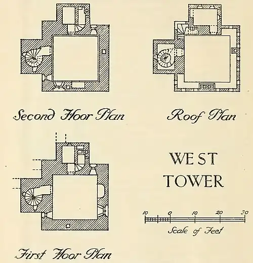 The west tower is the best preserved part of the castle, and shows clear evidence of having been completely finished. It is in plan a square of 25 feet projecting 6 feet into the moat from the line of the revetment wall, and has square turrets on the north-east and south-west, the former containing a newel stair and the latter the garderobes, the shafts of which discharge like those of the gatehouse into a chamber opening on the rampart walk. The tower is of three stories, with a splayed plinth at the ground floor level, and weathered strings at the first and second floors; the two turrets rise one story higher. The wall tops are embattled, with stone copings to the vents and crests, and the roofs were leaded and flat or of very low pitch. The general masonry details are like those of the gatehouse, but the patterns in black brick are simpler. Each room is lighted by a two-light window, and also by two single light windows in the re-entering angles at north and south. The fireplaces have plain arched brick heads, and two of the three octagonal brick chimney shafts remain. The accommodation on each floor is the same, namely a large room with a small room off it, by which a garderobe is reached; the first floor of the gatehouse, as has been seen, is similarly arranged, though differently planned. Such sets of rooms were called lodgings,