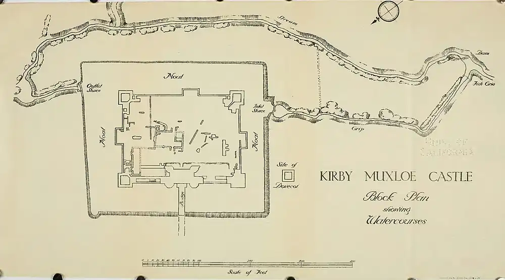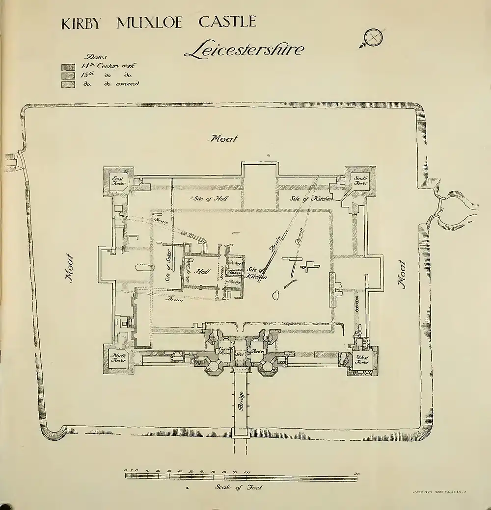 KIRBY MUXLOE CASTLE lies low and near a stream, in order to get an ample supply of water for the moat which surrounds it and forms its principal defence. It is planned as a rectangle 175 feet from north-west to south-east by 245 feet from north-east to south-west, with square towers at the four angles, a gatehouse in the middle of the north-west side, and towers of greater projection than the angle towers midway (except on the south-east) in each of the other sides. The internal measurements of the court were about 100 feet by 160 feet. For reasons already given, the castle was left unfinished, but enough remains to show that the gatehouse and towers were to be of three stories in height, joined to each other by two-storied ranges of buildings which did not, like the towers, rise directly from the waters of the moat, but were set back, leaving rampart walks defended by low walls between them and the moat. The main entrance to the castle was through the gatehouse on the north-west side, but there seem to have been posterns on the south-east and south-west.