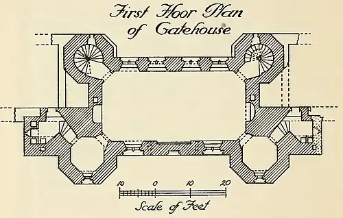 The ranges of buildings running north-east and south-west from the gatehouse were designed with two stories having embattled parapets towards the moat, but little of them exists beyond the broken wall-ends on the gatehouse, with remains of fireplaces, and the toothings on the west tower, and the condition of these latter suggests that the work came to an end before the ranges were finished.