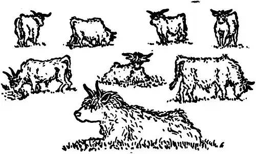 A lake without a fisherman, streams without a miller, pastures without a shepherd, road without a wayfarer. Only in the more fertile valleys graze the shaggy Scottish steers; they stand in the rain and lie down in the damp; perhaps that is why they are so overgrown with prickly tufts, as I have drawn them for you.