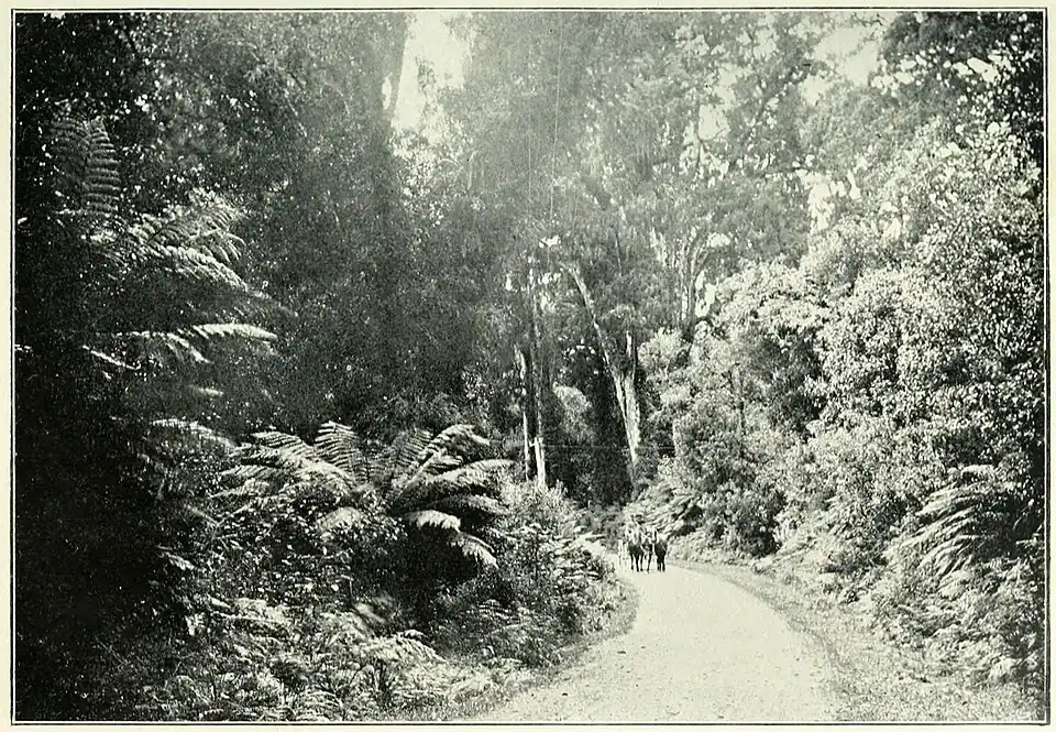 It is interesting in the dark nights to see, here and there, by the side of the tracks, under tree roots, and in damp soil, brilliant little lights, which have been often taken for glow-worms, but which are phosphorescent wood in a state of decay, giving out quite a strong illumination. In the open glades a full moon just topped the pine trees, leaving all else in dense shadow. Here in this country, where animal life scarcely exists of any native sort, no sounds at night strike the ear, no rustling of rabbit or hare, or fox, or, indeed, any small creature; all is silence, save the occasional dropping of twig or leaf, the murmur of running streams, and sometimes the hooting of a native owl, "Morepork" by name, which exactly reproduces the shrill far-reaching sound of its cry.