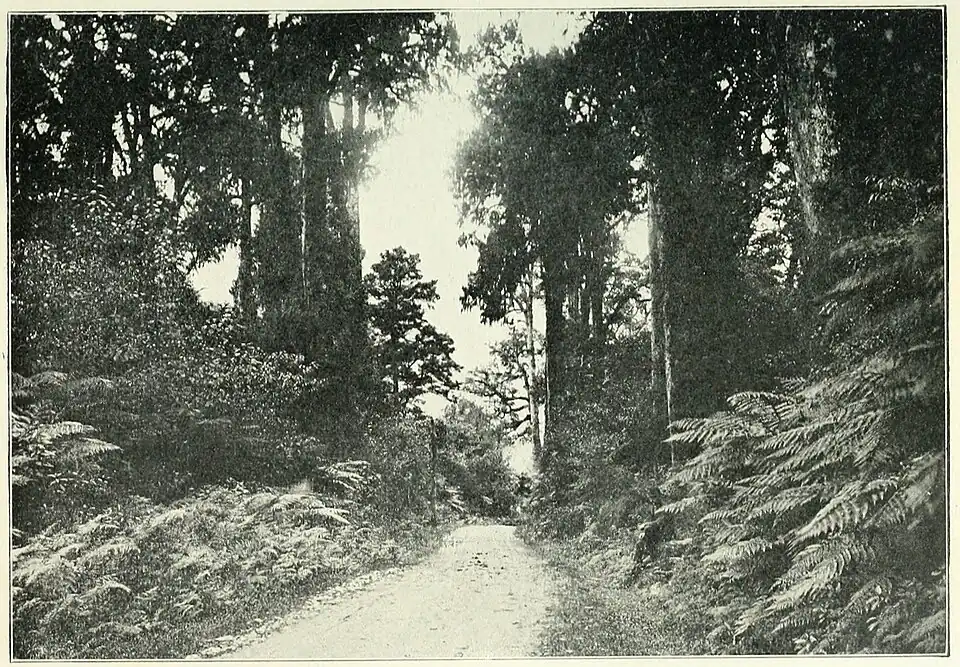 Arriving at Christchurch, I crossed the mountains to Hokitika by coach, a lovely journey, in fine weather, of two days, twelve hours coaching each day. Below the Otira Pass there are miles of red birch, its growth almost that of a cedar, straight reddish stems, and horizontal branches, peculiar, too, in the forest, as having no underwood; it only flourishes at a high altitude. Very noticeable below it, too, is the magnificent fern, the Todea Superba, commonly called the Prince of Wales fern, from the shape of its feathery fronds, covered with bright green velvety pile, which cannot be preserved in dried specimens. Curious, too, that it flourishes near the snow line, but if brought down to the lowlands must be kept under glass.