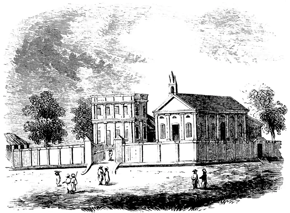 - ↑ Our illustration gives a fair representation of the Chintadrepettah church, school-house, and preaching bungalow. On the right is the church; next to it the school-house, (the high school,) two stories in height, with Venetian doors in the first story and Venetian blinds in the second. The back part of the school-house is but one story in height, with a low roof. Beyond the school is the open bungalow for preaching on week days, so stationed as to attract persons passing along the street, who will not enter a church. In Burmah, such a building would be called a Zayat.