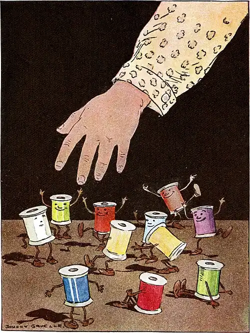 “Oh dear!” thought the spool, “He will tell the other spools of beautiful silk that I am here and I will be taken back to listen to their jeers!” And the poor little spool of linen thread tried to roll away.