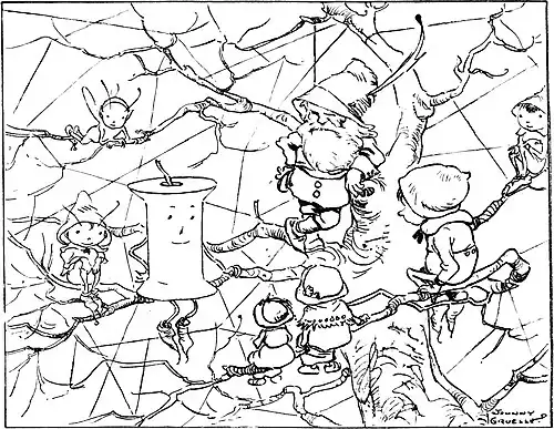 Presently the fire-fly returned and with him two little elves. “Just what we have wanted!” cried the two little elves as they clapped their tiny hands, and they gathered up the spool of linen thread and flew to a tall tree where they unwound the thread from the spool and stretched it tightly from one twig to another until the linen thread was stretched in a great number of strings across the twigs and branches of the tree. As the last string was stretched