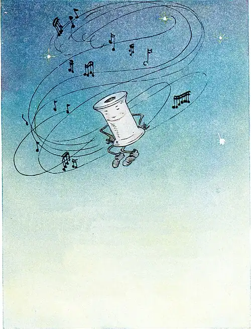Other little elves, fairies and wood creatures, attracted by the wonderful harmony, came and sat upon the branches of the tree and did not speak, for they, too, were filled with the joyousness of the soft music. And so the hours passed swiftly away and melted into days and weeks and still the little spool upon the twig in the old tree listened to the melodies of his own threads as the wind breathed upon them and caressed them.