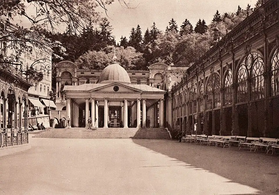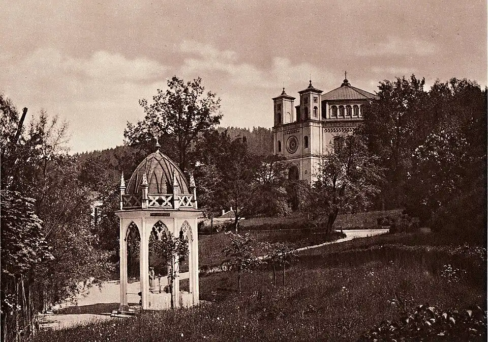 | MARIÁNSKÉ LÁZNĚ. The district of the healing Springs on the brook of Auschowitz is since 1197 possessed by the abbey of Teplá. The healing power of the Springs has been known since the XVIth century. In the year of 1528 there has been attempted to get the salt from the source of Ferdinand, but without success. The systematical use of the sources, healing and economic, has been established till about the end of the XVIIIth century, by the effort of dr. Nehr and the abbots of Teplá. The previous attempts were only ephemeral. The conditions of the flourish of the place have been created by the chemical analysis of the water by the eminent specialists who declared its healing power. In the first decades of the XIXth century the sources have been couvered by constructions that are partly to see still nowadays. The first establishements date from the year of 1781 and about 1820 there was here already a great many of houses. The healing factors are the spring of Ferdinand, the Well of the Cross, the Spring of Maria, of Caroline etc., the mud-baths, the production of the salt of Teplá and the transmission of the healing water. Moreover, the beauty of the surrounding country adds much to the renown of our watering-place. | FRANTIŠKOVY LÁZNĚ. (The Watering-place of Francis.) These Springs and moors are very ancient. As was ascertained by the discoveries archaeologic, there has been originally lived only on the margins of the moors. The more explicit news about the springs we do receive only about the begin of XVth century. The healing power of the sources is soon described and mentioned in the contemporary treaties. Since the year of 1600 there begins the transmission and about the begin of the XVIIth century there come to Cheb the strangers willing to make use of the sources. Originally the water was used only to drink, but from 1707 also to bath. About the year of 1660 one begins to make use of the source of Francis. First of all there has been built the filling-house and the hotel. About the end of the XVIIth century the town of Cheb has bought here a tract of land and has founded on it in the year of 1793 a colony that is to be regarded as a good example of classistical plan-making. The place has been named originally the Village of Francis, but in the year of 1807 it has been given the name of Františkovy lázně (The Watering-place of Francis). In the year of 1865 the place became a town. |