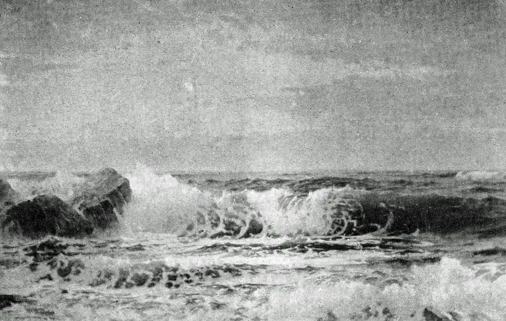 "They had from the first a very severe voyage, and as they approached New York, after nearly two weeks at sea, such a terrific snow storm came up that they had to put to sea again, without coal and leaking badly. To make matters worse the decks were coated thickly with ice and one paddle box was smashed. The wreckage was cleared away so as to allow the paddle wheel to revolve only with the greatest difficulty. Everyone on board, including the captain, almost gave up hope, but the ship pulled through safely and staggered into New York after a voyage of seventeen days." Among the fellow voyagers on this exciting trip were Mr. Samuel P. Avery, the New York picture dealer, and his family and the congenial friendship made at that time with this generous and intelligent man was a source of pleasure and encouragement through all the rest of Mr. Richards' career. In yet another way this remarkable voyage greatly influenced his subsequent life. It was then for the first time that his mind fully realized the majesty, power and beauty of the sea, and this impression, deepening with the years, led to the memorable pictures we all know so well.