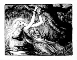 Sure enough, at the month's end down she stept, wrapped up in a black cloak, and a black hood over her yellow shining hair. Straight she went to the bog edge and looked about her. Water here and water there; waving tussocks and trembling mools, and great black snags all twisted and bent. Before her all was dark—dark but for the glimmer of the stars in the pools, and the light that came from her own white feet, stealing out of her black cloak.