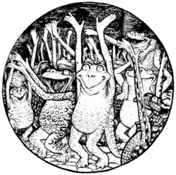 Then he went into the house, and looked for the ball, but could not find it. Night came on and he heard bogles move in the courtyard; so he looked out o' the window, and the yard was full of them.