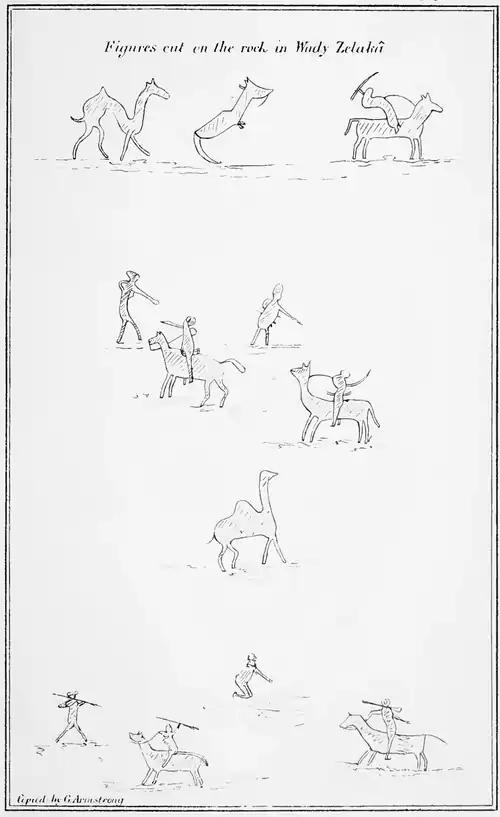 Next day our road led down Wâdy Zelegah, which bends towards the east, about a mile from the camping ground; and where the bed of the valley opens out Armstrong came across a stone circle almost buried in the sand, the top of the stones only being visible. Striking across to the eastern side of the valley, where a detached piece of rock stands conspicuously out, he found some Arabic inscriptions and a lot of figures, chiefly animals, rather roughly carved out on the face of the rock. The valley, though bounded by steep cliffs, has an open, level, and wide bed, which is one of the principal features of the wâdies in all this region, making the passage of even very mountainous districts easy for animals and even possible for wheeled traffic. No valley of importance joins the wâdy from a continuous line of high hills with cliff, cutting off all communication up that side.