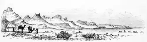 - ↑ He stated that we (the travellers) would be in no personal danger, but that his Arabs might be killed, our camels carried off, and we left in the lurch.