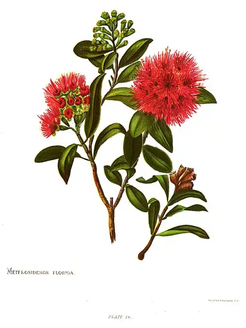 This is found throughout the Islands in forests, and has a most brilliant appearance when in blossom; it clothes the lower part of the tree, and becomes a tree itself, killing the one which assisted it to climb. The colour of the flower varies from scarlet to yellow, and is often quite spherical in shape. It resembles the Golden Bottlebrush of Australia, though brighter in colour. It flowers in Autumn, and the other Ratas in Spring.