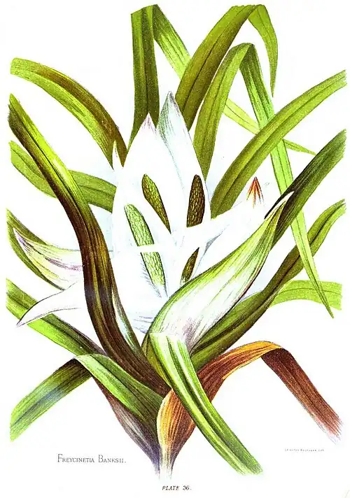 A very remarkable genus of chiefly Tropical Asiatic, Malayan, and Polynesian climbing plants, with long, rather grassy leaves. F. Banksii climbs the loftiest trees, rooting as it ascends, and branching copiously. Hook. fil. The inner leaves and spike are of a thick, white, juicy substance, which is said to make a good preserve; the young Colonists are fond of eating it, a taste shared by the rats, so much so, that it is difficult to obtain a perfect specimen. The leaves are used for basket making. Hab. Northern and Middle Islands. It flowers in November.