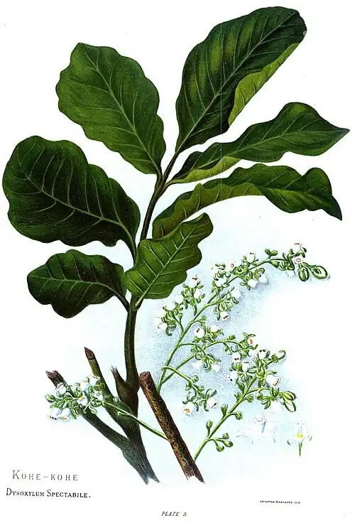 A large tree, forty to fifty feet high or more, with spreading branches and large dark green and glossy pinnate leaves. The flowers are waxy white, and are remarkable for being placed in long pendulous panicles springing from the branches considerably below the leaves. The leaves are very bitter; and an infusion of them is said to possess valuable tonic properties. It is confined to the North Island. It flowers in July and August.