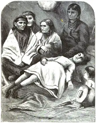 After the Indians had slept about two hours, they rose and made their preparations for departure. The youngest papoose was slung over the mother's back. The skins and mats were put on a rough sledge, and drawn by two boys of eight and ten years. The few cooking utensils were packed in a bag and given to a girl somewhat older than Nattie. The tent was struck, made into a bundle with divers bows and arrows peeping from its folds, and hung to the arm of the great man. Over his other shoulder he soon slung the sleeping Nattie, and thus she was traveling wilderness-ward, in her unconscious state, all the long day during which her friends were seeking for her, in her native village.