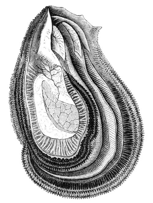 The Oysters have a shell composed of two unequal valves, usually thick and irregular, connected by a hinge of the simplest character, without teeth. Externally the surface is rough, and composed of a great number of foliations loosely plaited, or marked with radiating furrows. The lower valve is more or less hollowed, the upper one flat.