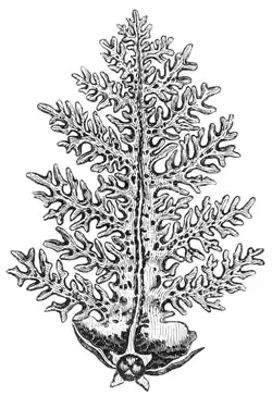 BRANCHIAL PLUME OF DORIS.The breathing organs consist of flat plumes, sometimes small and simple, sometimes large and branching, either united at the base into a flower-like expansion, or placed separately in a circle more or less perfect. In some species these plumes are capable of being withdrawn into a common cavity, the margin of which can be closed completely over them, but in others there is no cavity; and when danger threatens, the plumes are merely contracted, curled up, and bent down towards the centre of the circle.