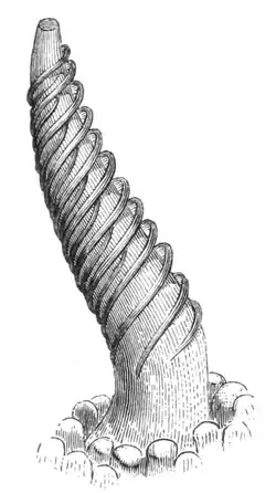 TENTACLE OF DORIS.The upper or dorsal tentacles are generally short club-shaped organs, with the upper portion frequently bent into an angle. This portion is always set with narrow, oblique plates, usually ten or twelve in number, pointing behind and downward. They are always retractile, but for the most part not sheathed.