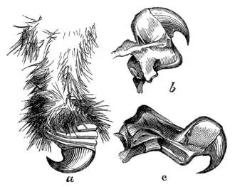 Every one is aware, who has handled the velvet paw of a cat, that in its ordinary condition the talons are quite concealed, but that in excitement they are forcibly thrown forward. The last joint of each toe, the tip of which is encased by the claw, is, in rest, drawn back either upon, or at the side of, the preceding joint, by the force of two elastic ligaments. From this position it is in an instant extended by the contraction of a muscle beneath the toe, the tendon of which passes under the head of the last joint, as under a pulley, and is attached to the base of the claws. When the contraction ceases, the claw again springs back to its place, and lies concealed in a deep fold of the skin.