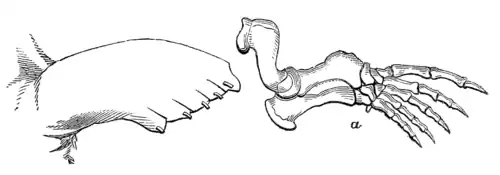 limbs are feeble; but the toes are still distinguishable, and serve as supports to a large extent of web, constituting an apparatus admirably adapted for propelling the animal through the water, and calling to mind the feet of the Diver (Colymbus) or Great Auk, (Alca impennis,) both as to appearance and position."[2]